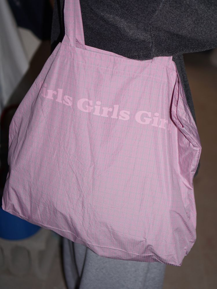 This big shoulder bag stands out with its playful color contrast and a ‘Girls Girls Girls’ printed shoulder strap.